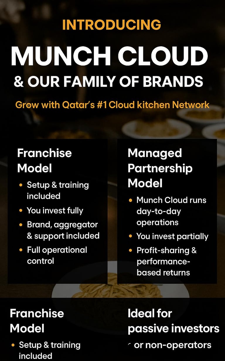 Munch Cloud Culinary Concepts is Qatar’s premier cloud kitchen and virtual restaurant operator, delivering chef-crafted meals 24/7 through the nation’s top delivery platforms. Founded with a vision to revolutionize the food business, Munch Cloud operates multiple successful virtual brands and physical outlets — powered by a seamless ecosystem of technology, kitchen infrastructure, and operational support.